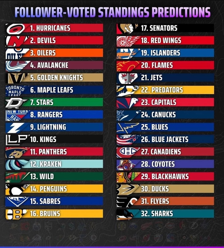 Методология ранжирования: Группа хоккейных комментаторов, аналитиков и редакторов составляет свой рейтинг 1–32 на основе результатов, достигнутых командами к среде. *Примечание: Предыдущий рейтинг и процент набранных очков указаны по состоянию на конец недели.*